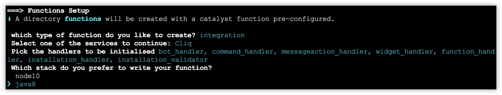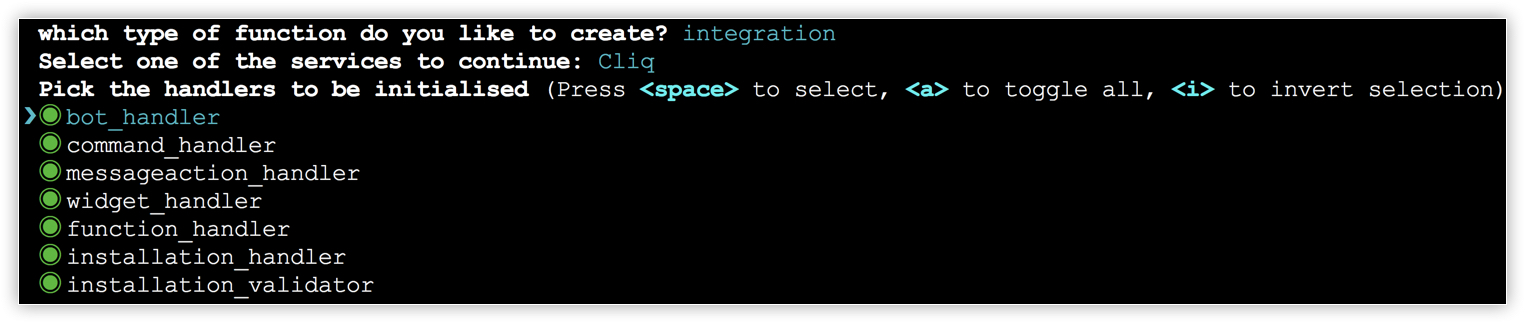 - All Cliq handlers classes will be selected by default. You can leave it as it is, or select only bot_handler, command_handler, and function_handler from the list. Press Enter.