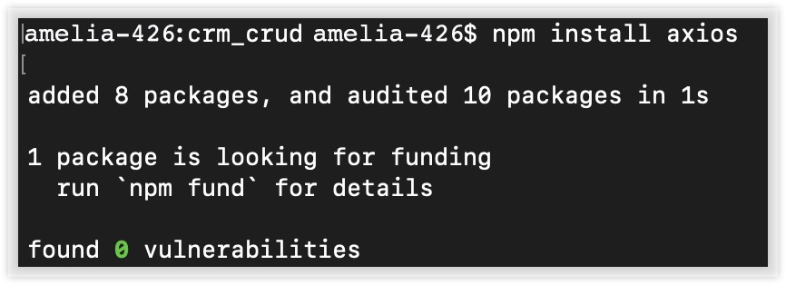 To install axios, execute the following command from the Node function's directory navigate to the Node function's directory (functions/crm_crud):