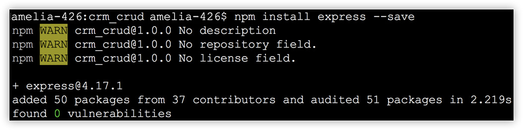 To install Express.js, navigate to the Node function's directory (functions/crm_crud) in your terminal and execute the following command:
