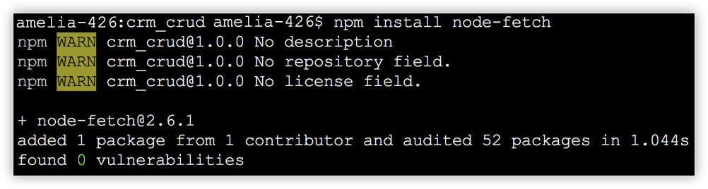 To install node-fetch, execute the following command from the Node function's directory navigate to the Node function's directory (functions/crm_crud):