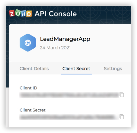 We must now register the client application in the Zoho API console, to generate the following credentials: