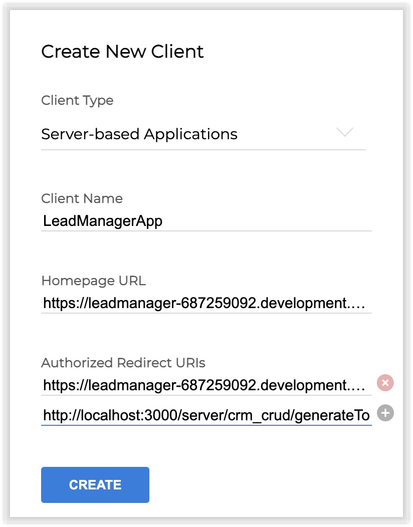 - Authorized Redirect URIs: {APP_DOMAIN}/server/crm_crud/generateToken