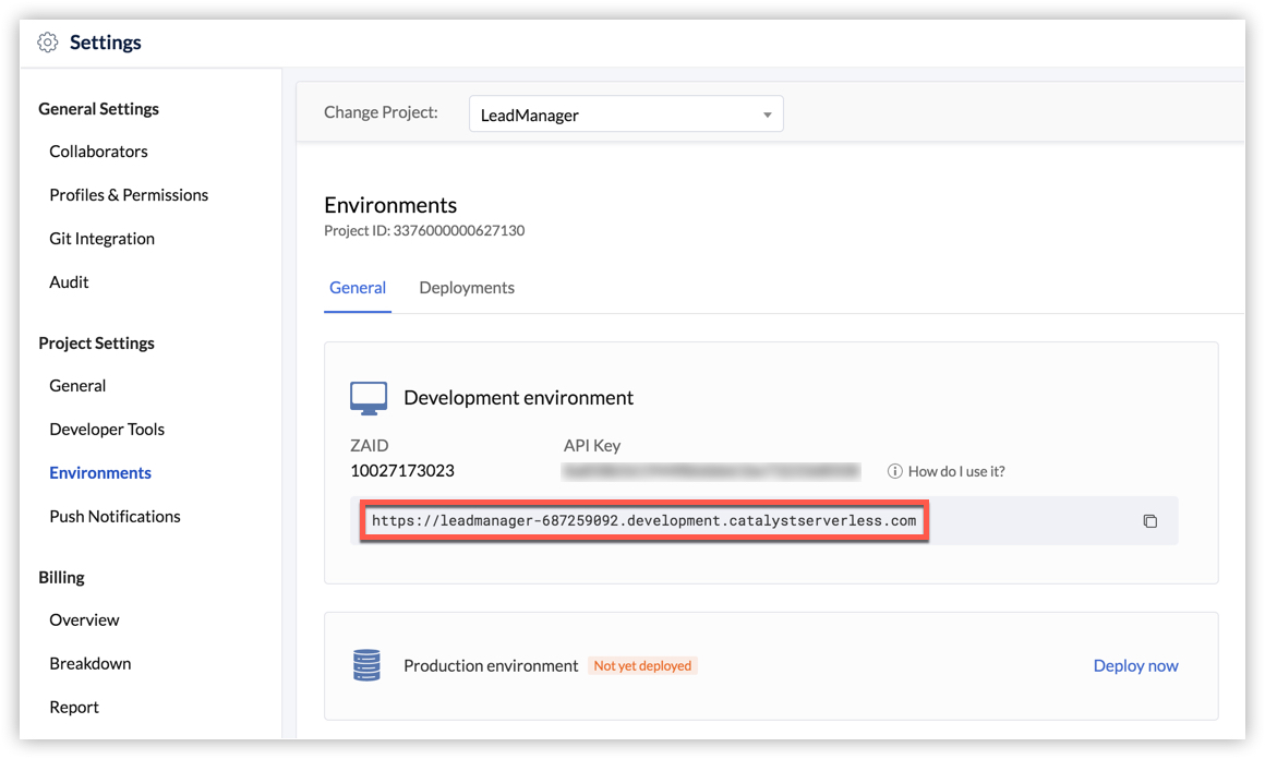 For example, the homepage URL in this case will be: https://leadmanager-687259092.development.catalystserverless.com/app/index.html