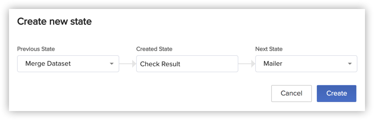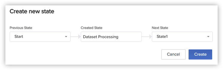 This will open a pop-up box. Enter the parallel state's name as "Dataset Processing". Set its previous state to "Start" and next state to the default "State1". Click Create.