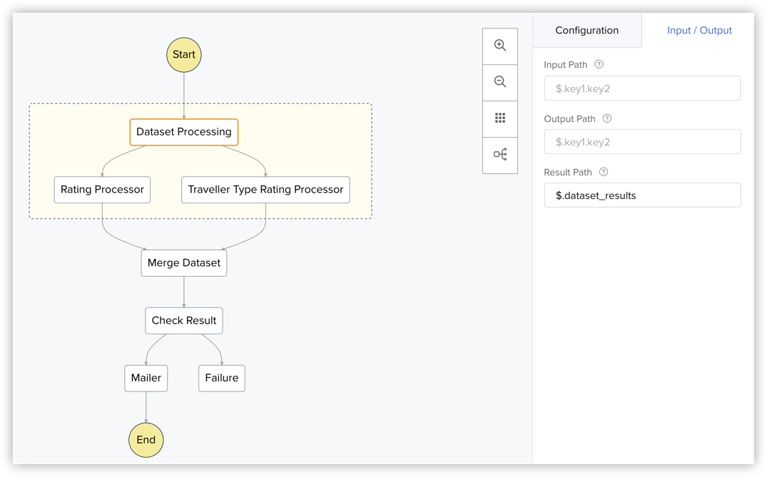 - Dataset Processing: Click on Dataset Processing state from the builder and click the Input/Output tab for it. Enter the value for its result path as "$.dataset_results". This will assign the results obtained from processing the RatingProcessor and TravellerTypeRatingProcessor functions to the variable dataset_results.