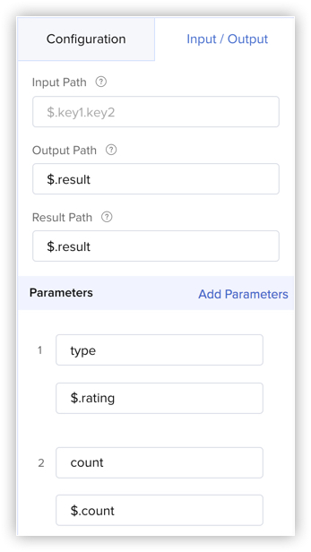 - Rating Processor: Enter the following values for the Input/Output of the Rating Processor state. This selects the results obtained by the RatingProcessor function's execution and assigns it to the variable result. That value is then added to the input JSON of the circuit. Add two parameters named "type" and "count" to pass the rating and count input values from the user to the function respectively.