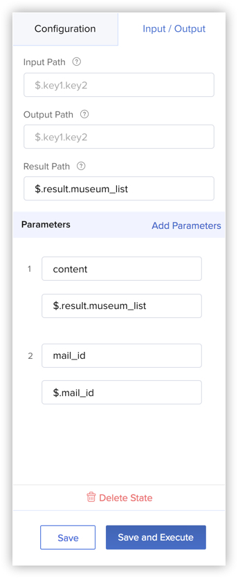 - Mailer: Enter the following values for the Input/Output of the Mailer state. The final list (result.museum_list) obtained from the MergeDataSet function is passed as the content parameter and the user's email address is passed as mail_id. The museum list is also passed as the circuit's output by adding it as the result path in this state.