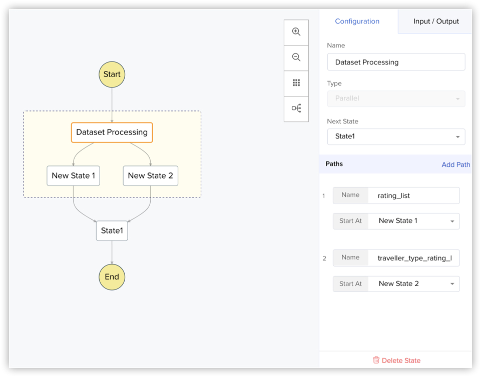 Now in the Dataset Processing state's configuration, click Add Path and enter path's name as "rating_list". This will automatically assign the path to a new state called New State 1. Similarly, add another path and enter its name as "traveller_type_rating_list". This will assign the path to New State 2.