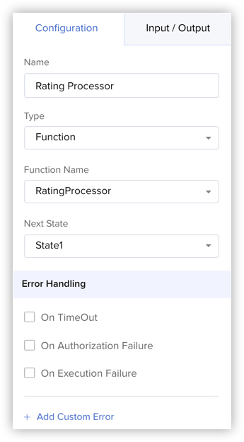 Now click on New State 1 in the builder. Enter the state's name as "Rating Processor". Assign its type as a Function state and associate it with the RatingProcessor function from the drop down-lists.