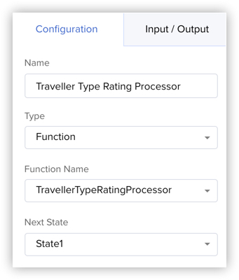 Similarly, click on New State 2 in the builder. Enter the state's name as "Traveller Type Rating Processor". Assign its type as Function and associate it with the TravellerTypeRatingProcessor function.