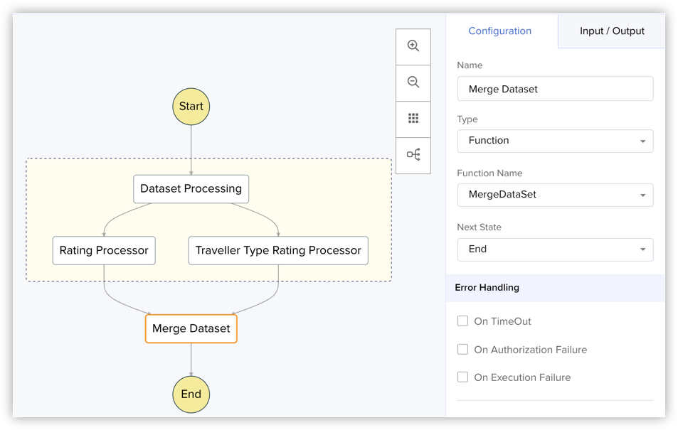- Merge Dataset: Enter the following values for the Input/Output of the Merge Dataset state. The result assigned as dataset_results by the parallel processing previously, is passed as the input to this function, and the function's output is assigned to the result variable again. We will not be passing any parameters here.