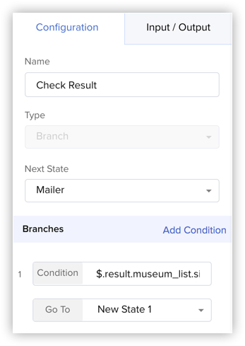 In the Check Result state's configuration, click Add Condition and enter the condition as "$.result.museum_list.size() == 0". This will automatically assign it to a New State 1.