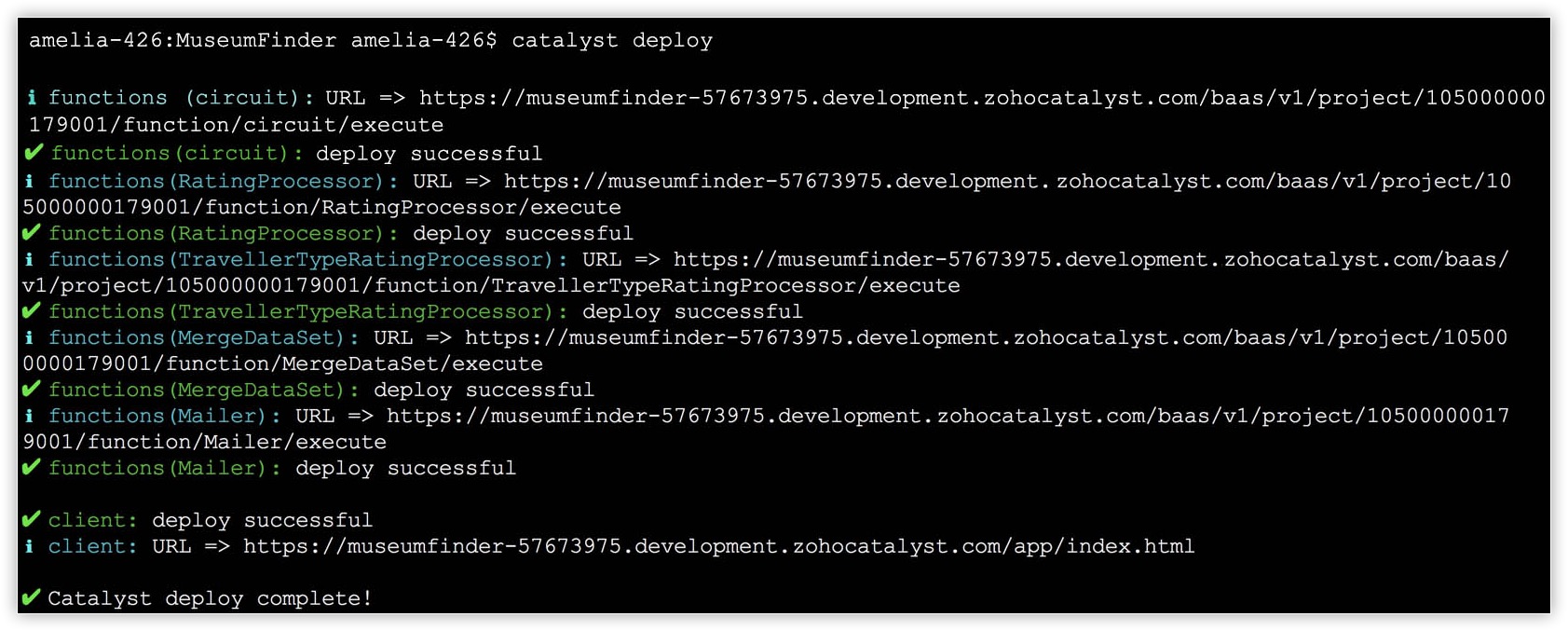$ catalyst deployThe functions are deployed first, followed by the client component. The production URLs of the components are displayed.