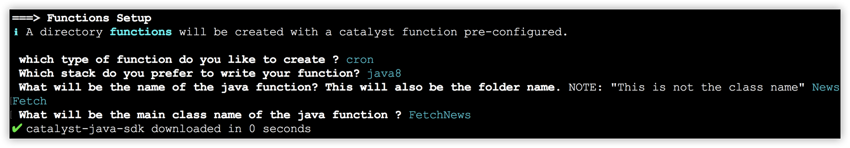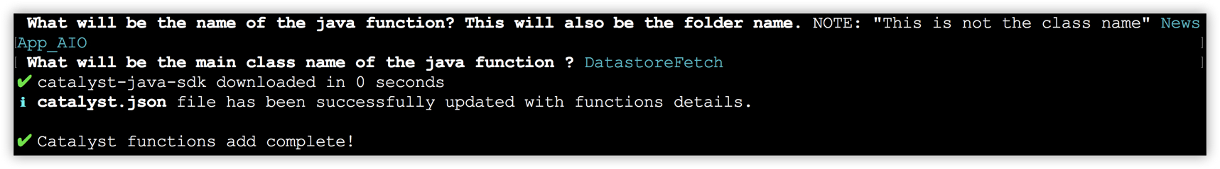 The CLI will install the Catalyst Java SDK on your local system and update the information in the configuration file.Note:Ensure that you enter the package name, or class name and folder name, exactly as instructed, because the application's code contains the same names.