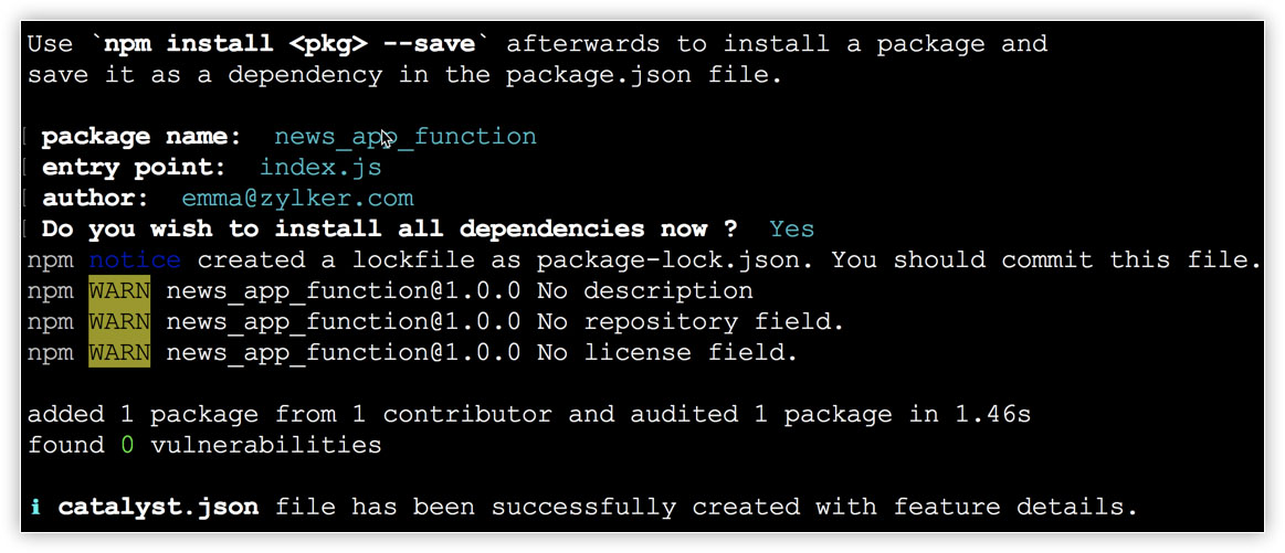 If you select Node.js, enter "news_app_function" as the package name, "index.js" as the entry point, and your email address as the author and press Enter. You can press Enter to fill the default values.