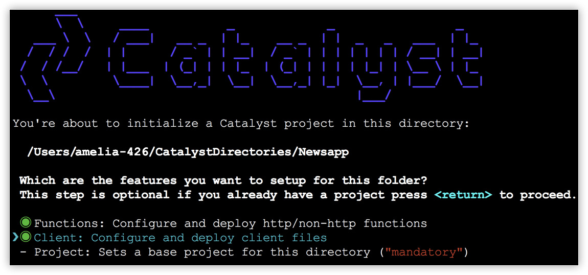 $ catalyst init - Select Client and Functions using the space bar. Press the Enter key to initialize.