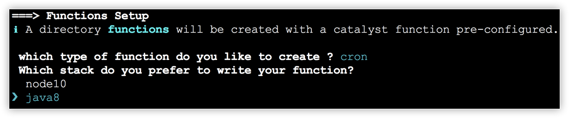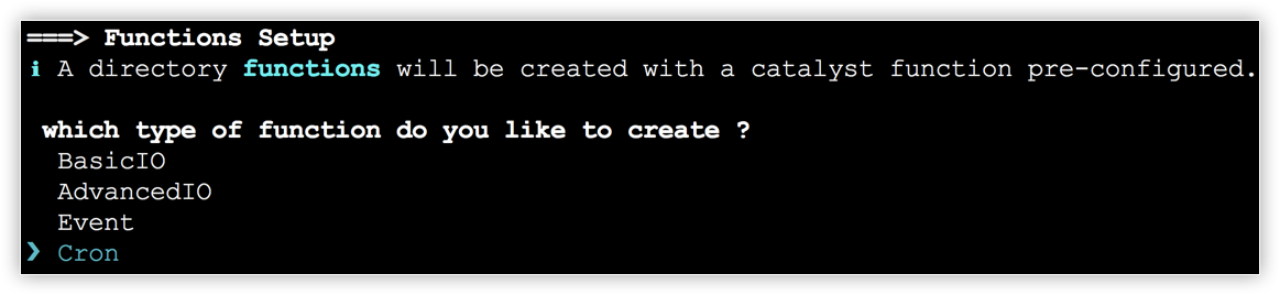 - The CLI will initiate the function setup. Select Cron as the function type.