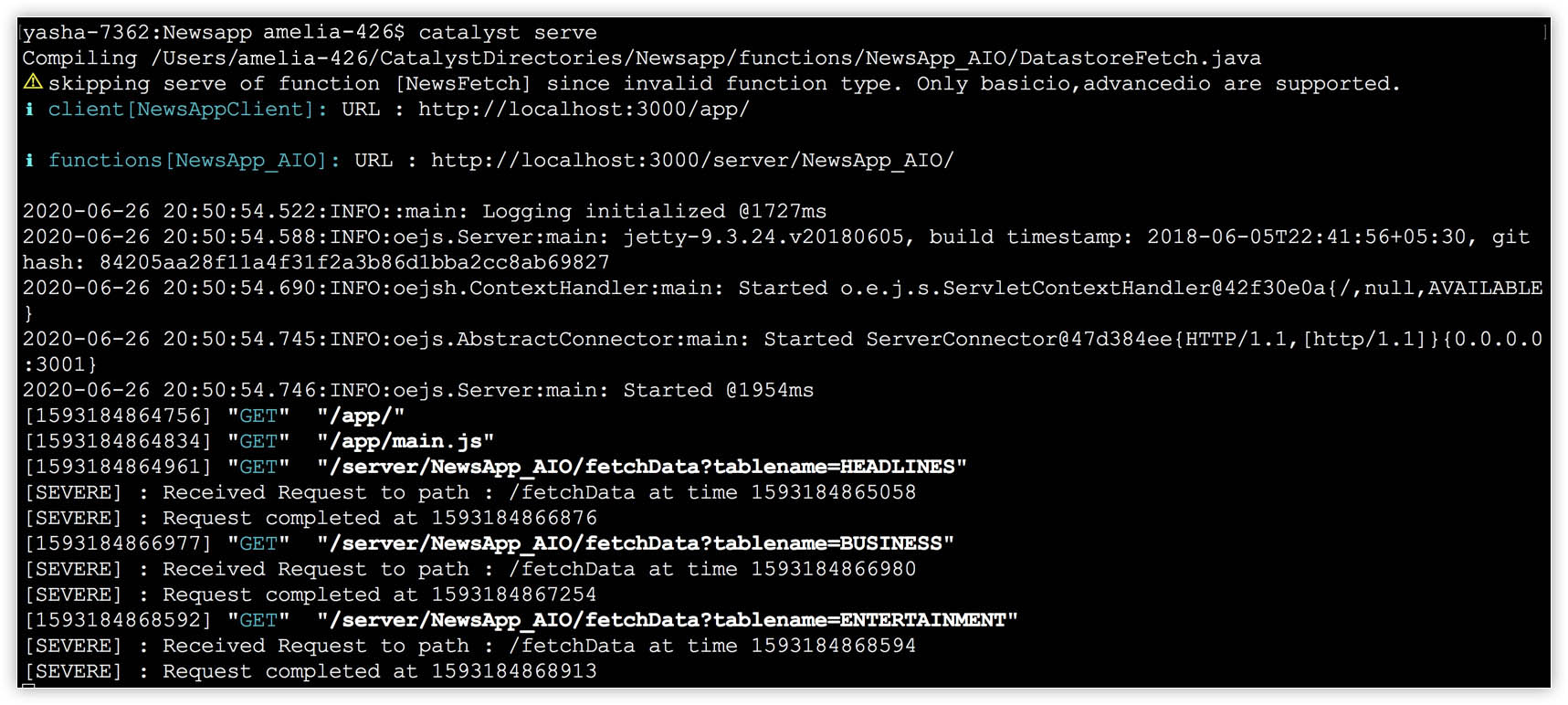 $ catalyst serveThe news application will now be served at default port 3000. The local endpoint URLs of the components are displayed.