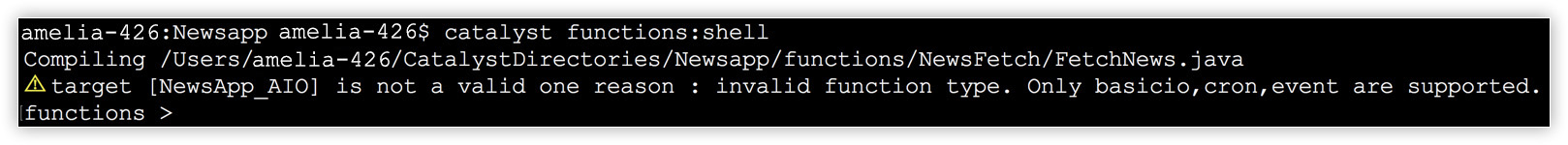 To open the functions shell in your CLI, execute the following command from your project directory (CATALYST_PROJECT_HOME):