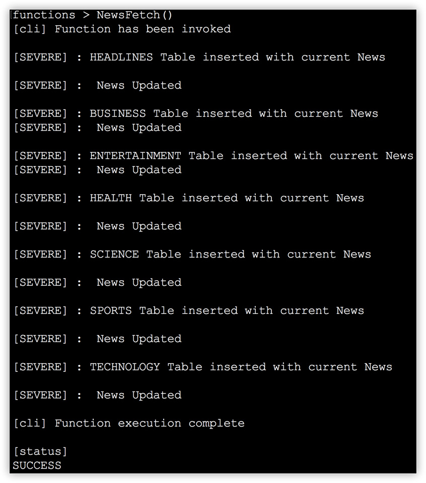 To invoke the function, enter NewsFetch() in the shell if you configured it in Java or newsapp() in the case of Node.js and press Enter. This will make the API call to NewsAPI and fetch the news items from each category, and populate them in the Data Store.