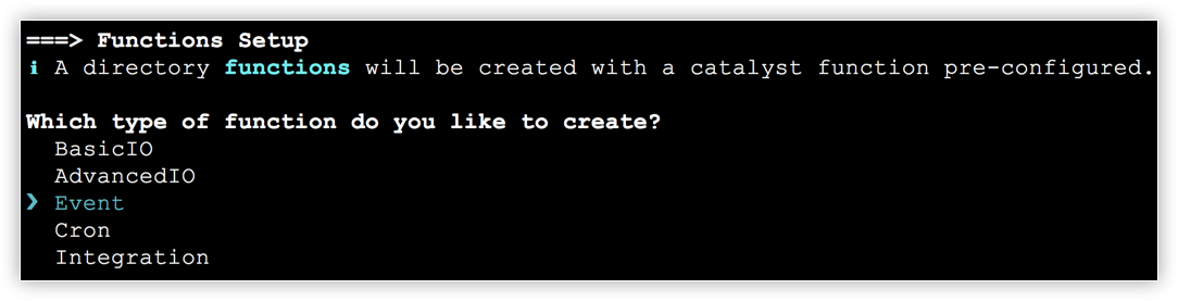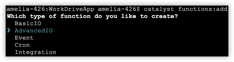 $ catalyst functions:add - Select Advanced I/O as the function type and press Enter.