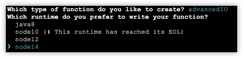 - Select the latest runtime of Java or Node.js as the function stack, and press Enter.
