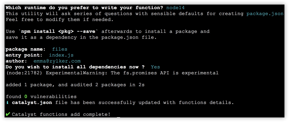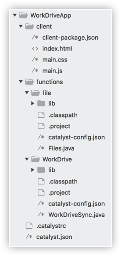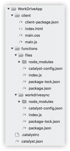 Your project directory (CATALYST_PROJECT_HOME) is now set up with the client directory (CATALYST_CLIENT_HOME) and the functions directory (CATALYST_FUNCTIONS_HOME) along with configuration files and dependencies. The functions directory contains either the Java or Node.js function. The project directory also contains the catalyst.json configuration file and a hidden catalyst.rc file.