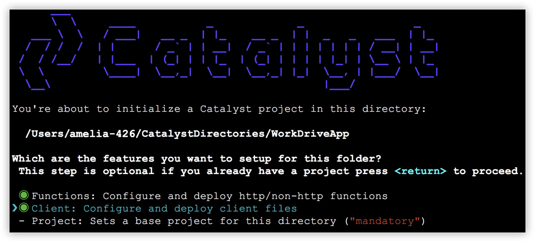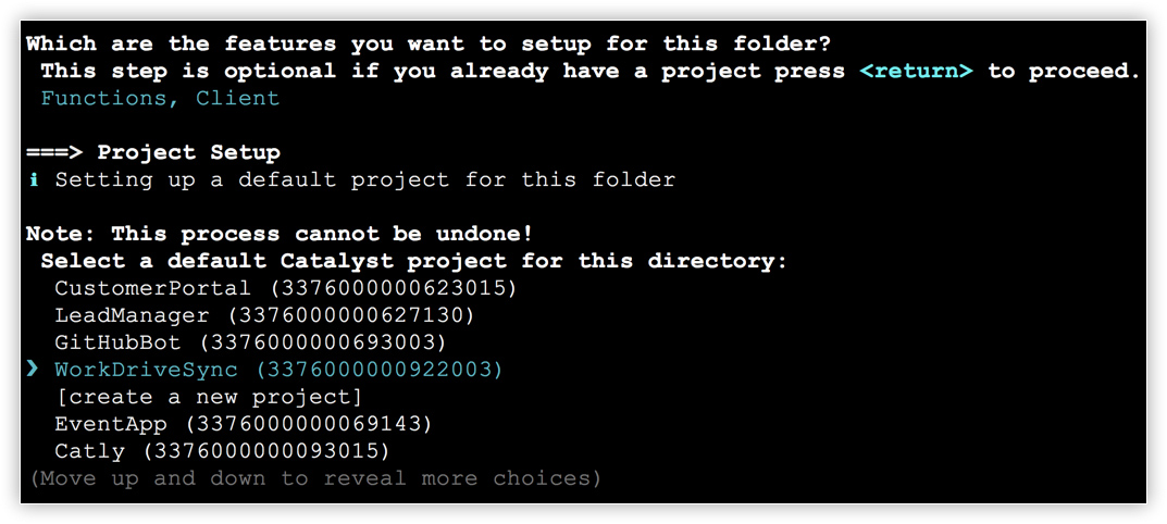 - The CLI will now ask you to associate a Catalyst project with the directory. Associate it with the project that we created earlier from the console. Select WorkDriveSync from the list and press Enter.