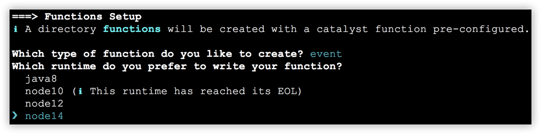 $ catalyst init - Select Client and Functions using the space bar. Press the Enter key to initialize.