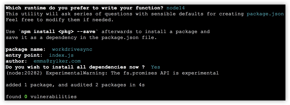 If you select Node.js, enter "workdrivesync" as the package name, "index.js" as the entry point, and your email address as the author and press Enter each time. You can press Enter to fill the default values.
