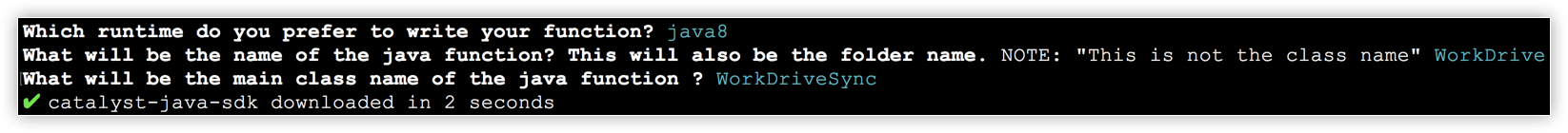 If you select Java, enter "WorkDrive" as the folder name and "WorkDriveSync" as the class name. Press Enter each time.