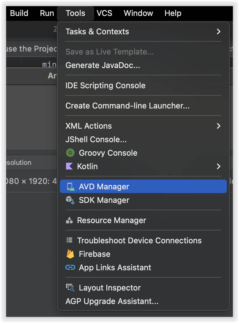 - Navigate to Tools > AVD Manager in the Android Studio in your project.