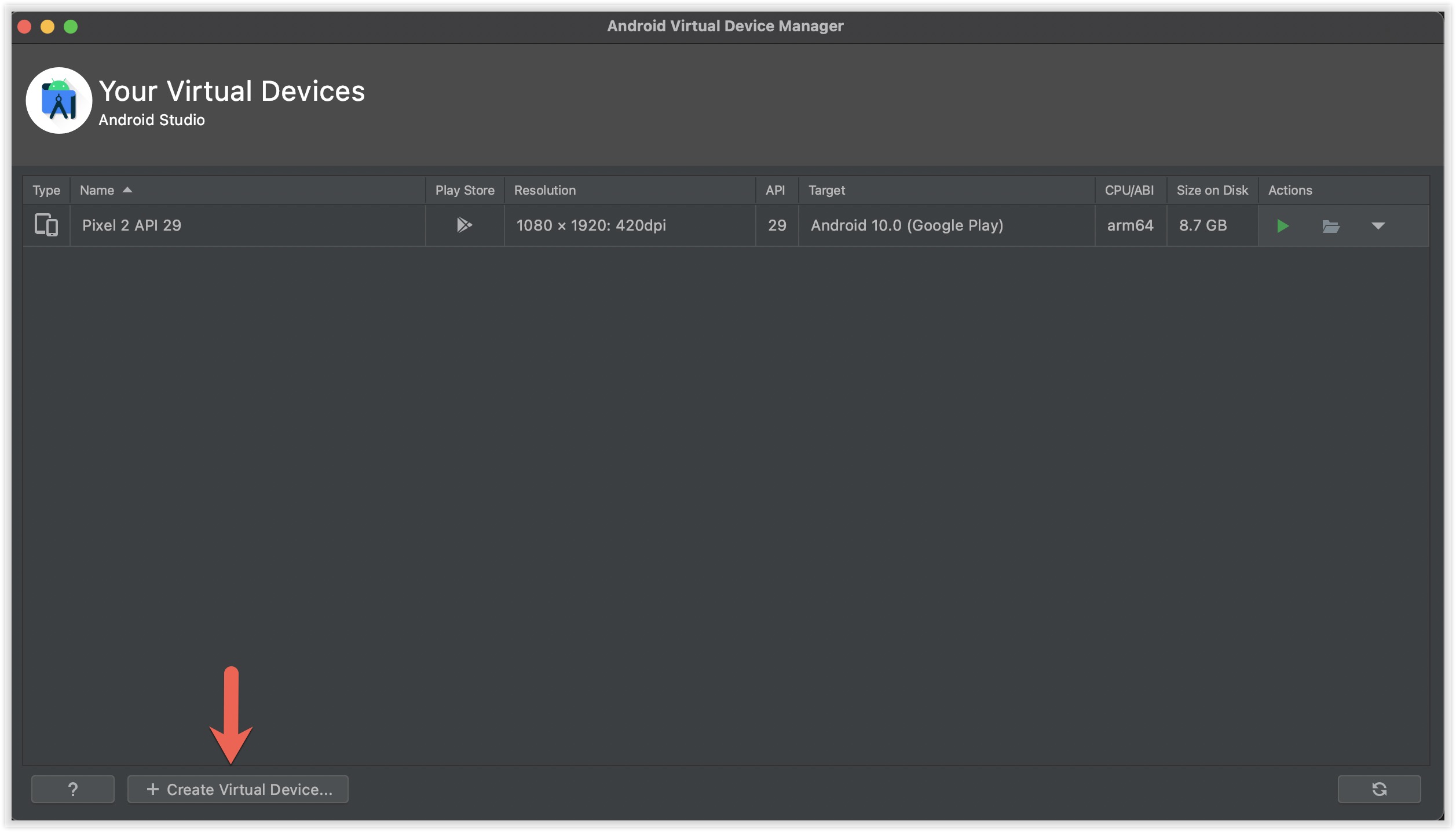 If you don't already have a virtual device set up for the app's target API level, follow the steps mentioned below to create a virtual device through AVD (Android Virtual Device) Manager, and run the app on it.