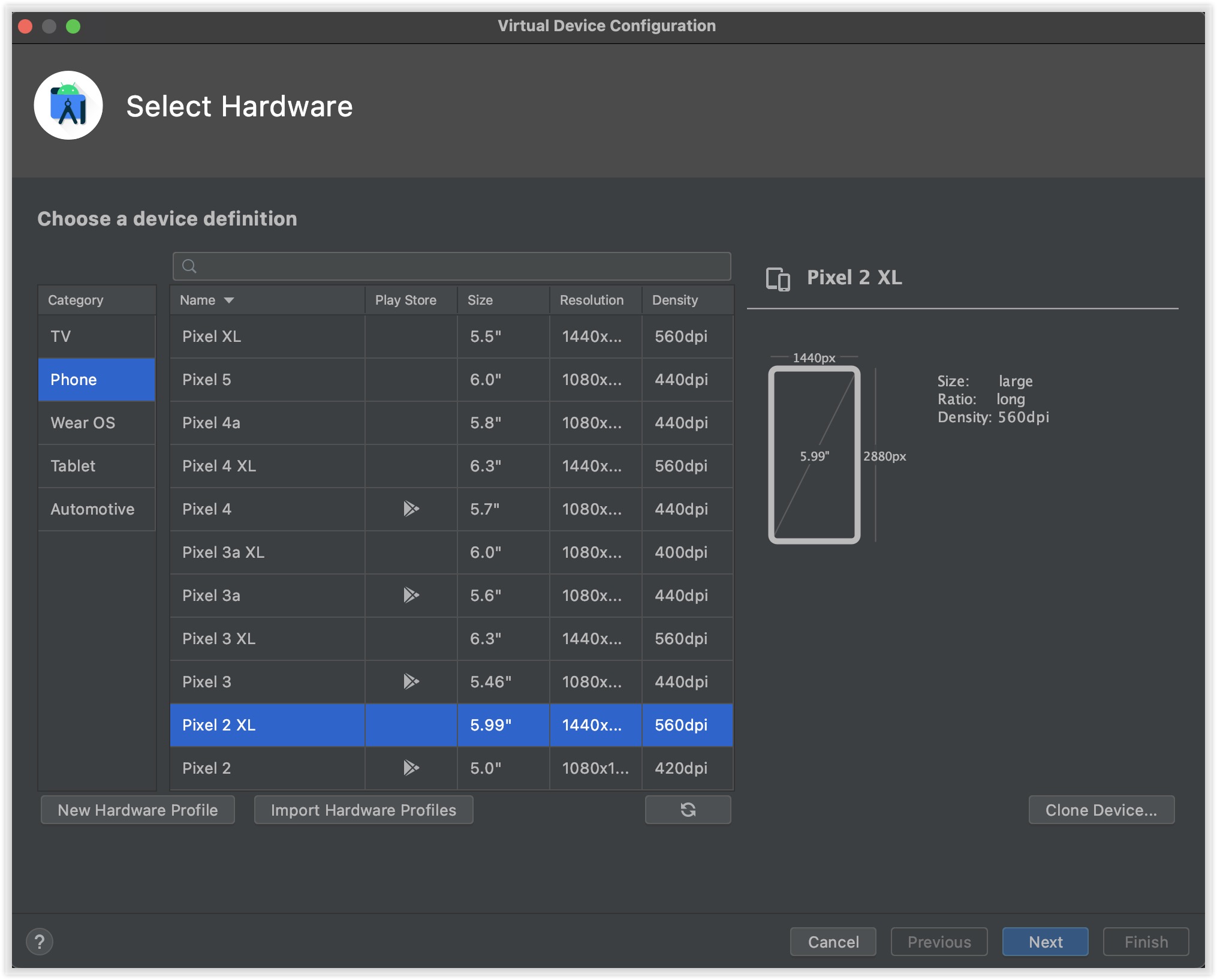 - Select an optimum hardware profile for the API level the app targets, which is 29, then click Next.