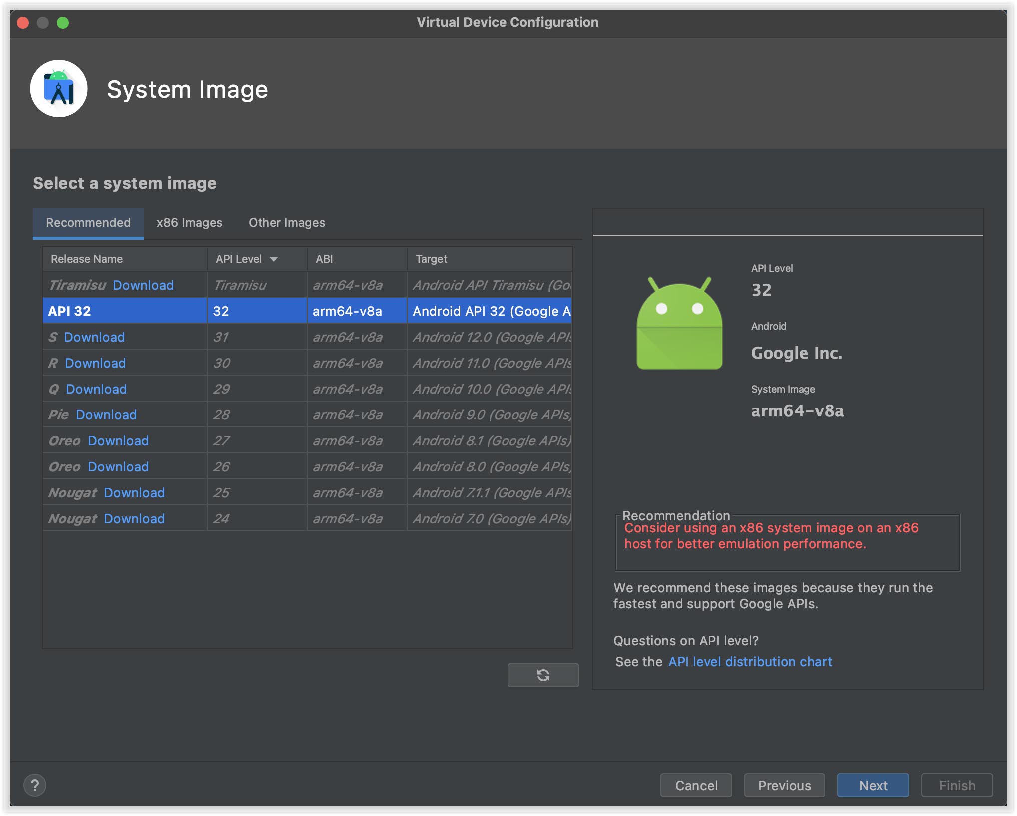 - Select a system image corresponding to the target API level from the Recommended system image tab, then click Next.