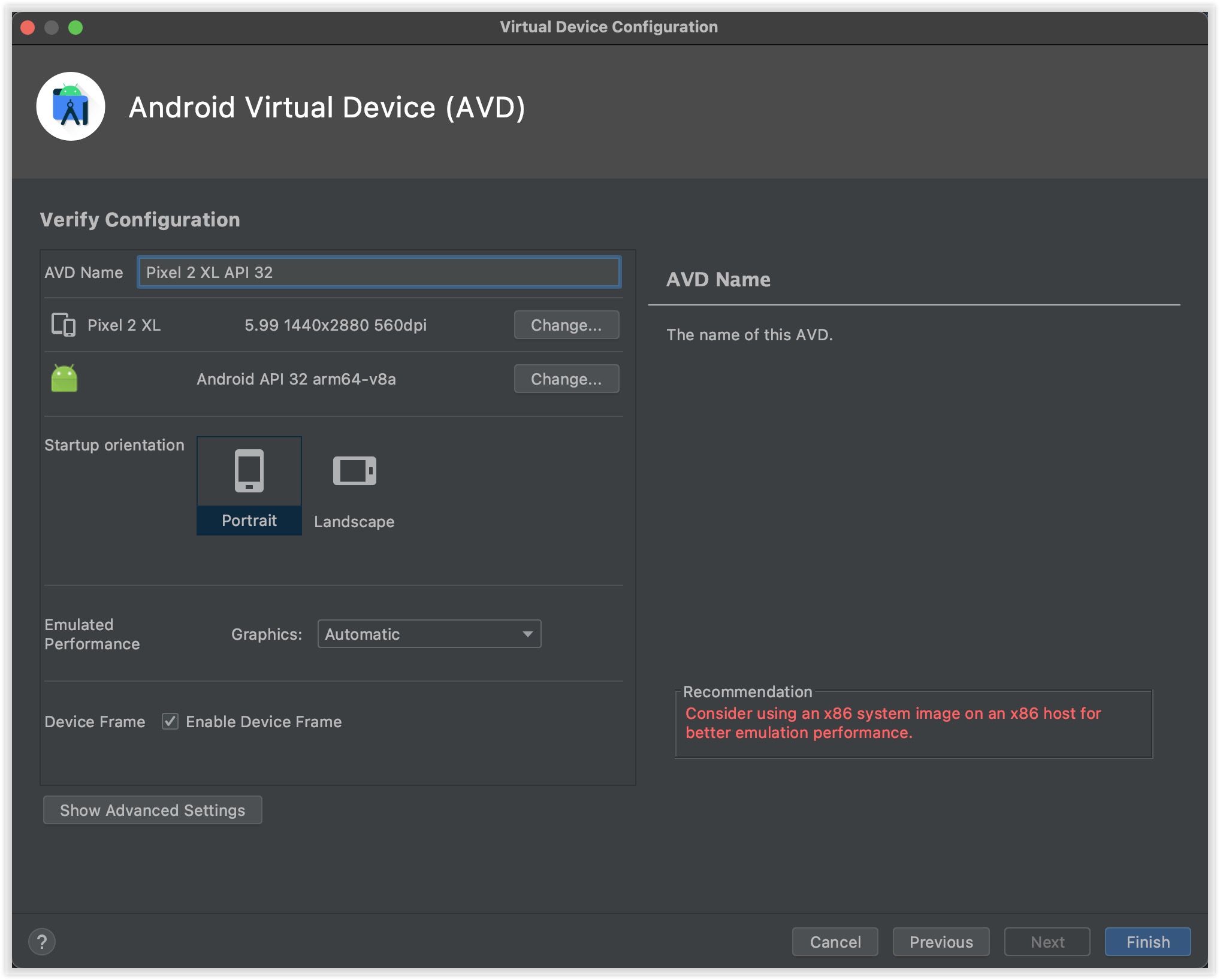 - You can verify the configuration properties, then click Finish to create the virtual device.