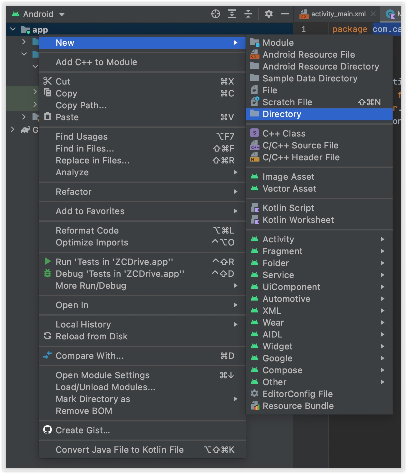 - Navigate to the ZCDrive project in the Android Studio. Select app from the directory, then right-click it. Select New > Directory.