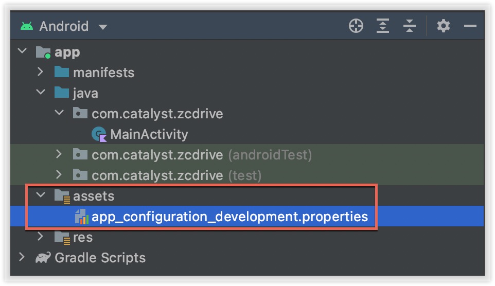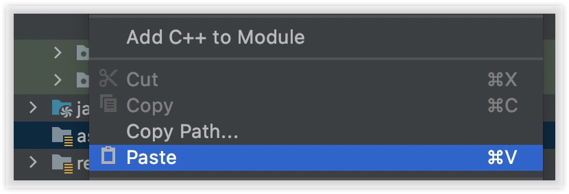 Alternatively, you can create this directory in the specified path through your system's file manager directly. - Copy the app_configuration_development.properties file that was downloaded. Now, right-click the assets directory that was created in Android Studio, then click Paste to paste the file. Confirm the action, if prompted.