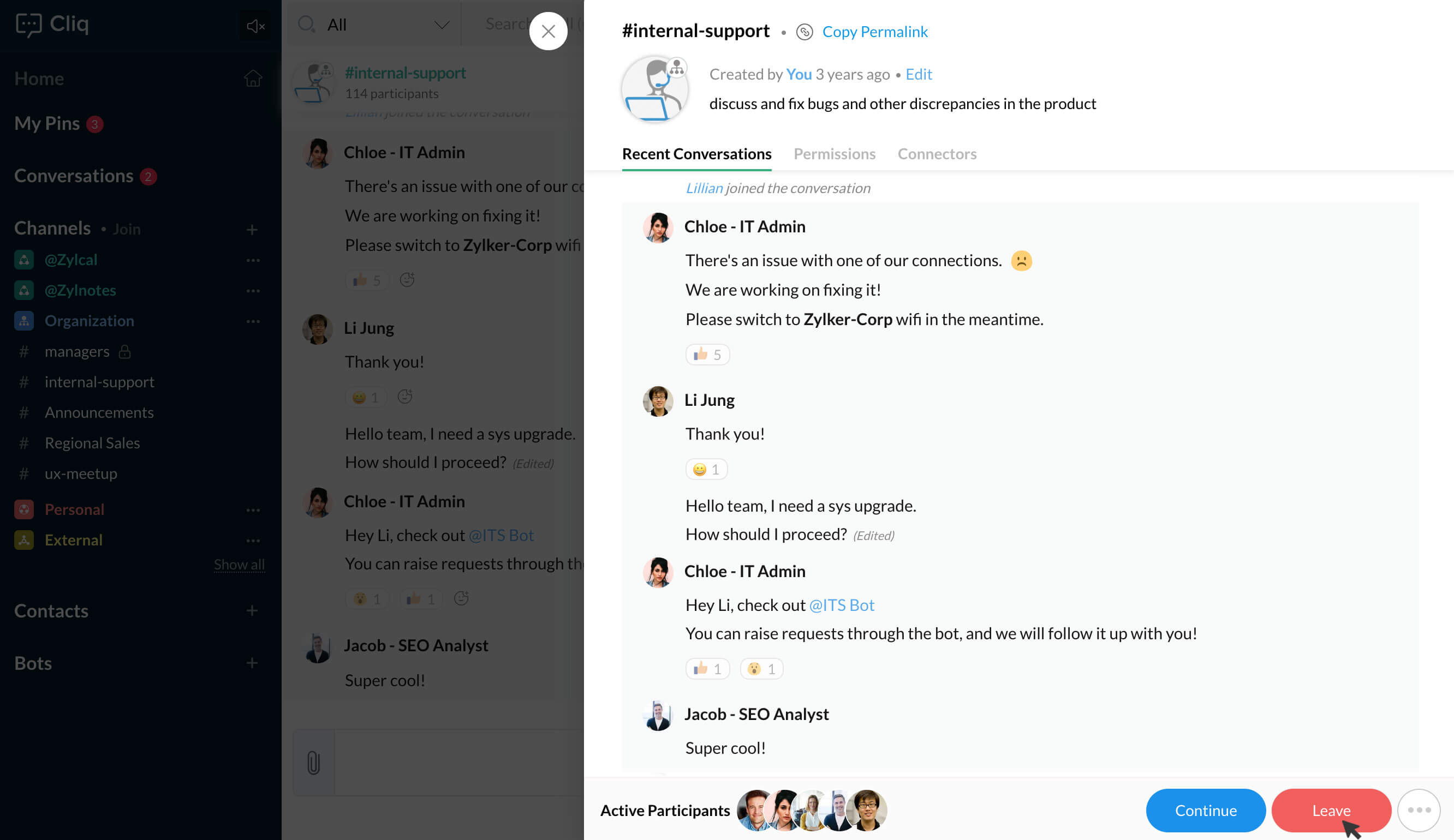 - To leave a channel, click Actions -> Leave option at the bottom right of the chat window.
