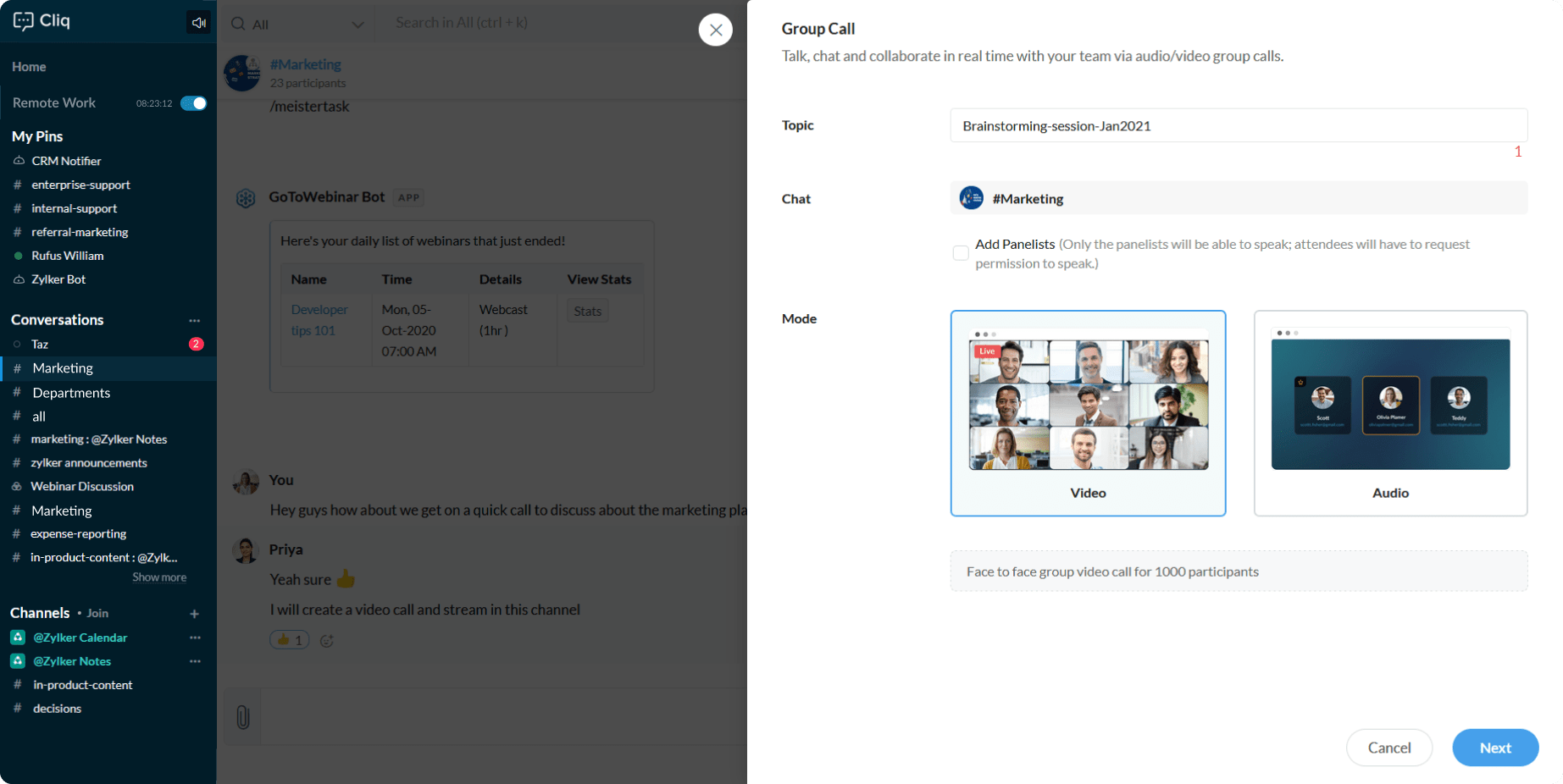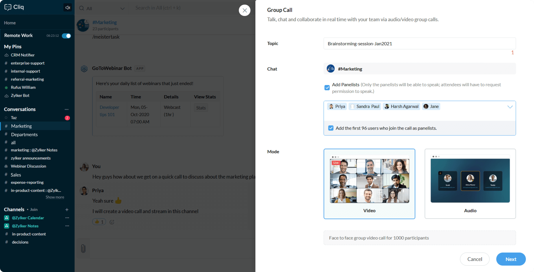 Say you want to host an organizational level meeting where the members in the key role will address a gathering of 1000 people virtually, so from Cliq, you can host a video call where you can add the key members of the organization as the panelist, the other participants will be automatically categorized as active participants and silent participants depending upon the number of participants you have added as a panelist.