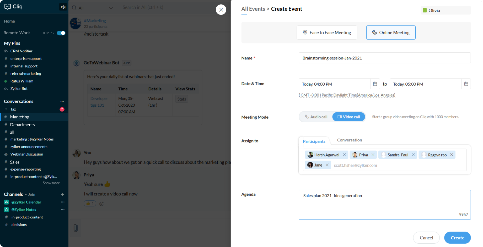 Say you want to schedule a video call for an upcoming event where you have a large group of participants. For this upcoming meeting, from Cliq you can invite and schedule the meeting, The meeting invitation will include the location and the agenda of the meeting. While you create a meeting, you can set reminders to alert the participants to attend the upcoming meeting promptly by scheduling a group call via Calendar Events.