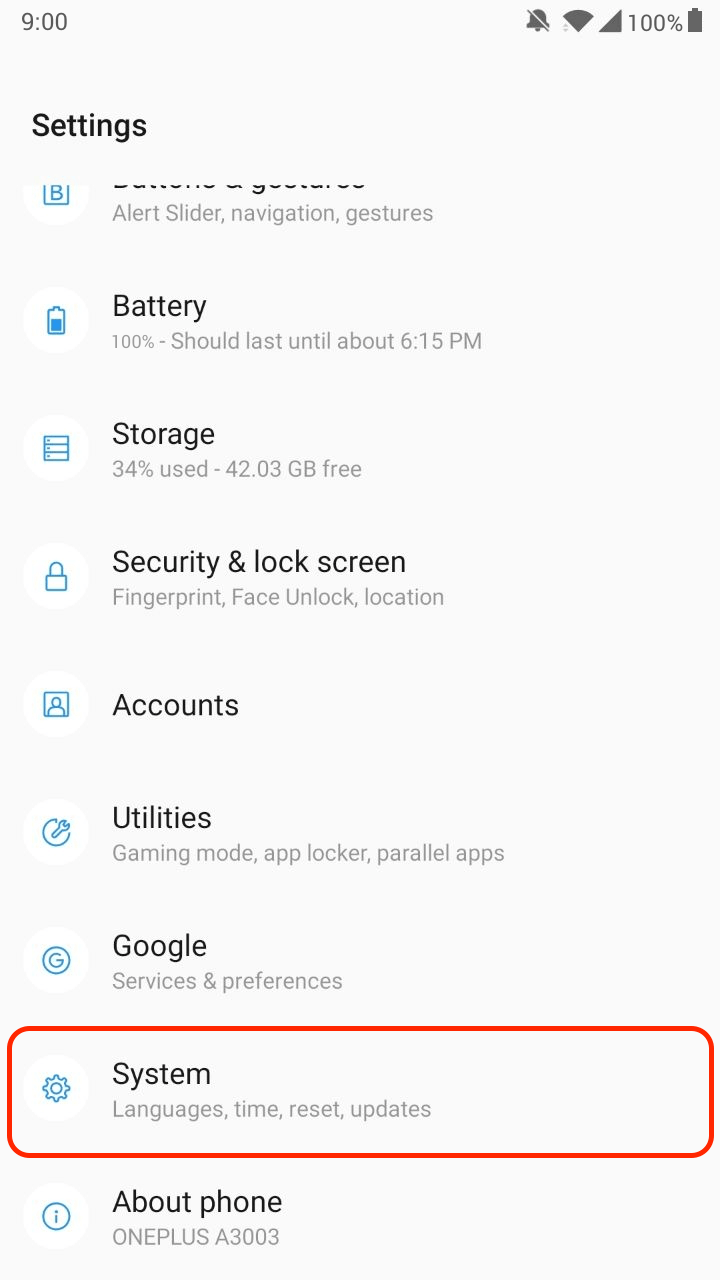 - From the app drawer, open Settings -> System.