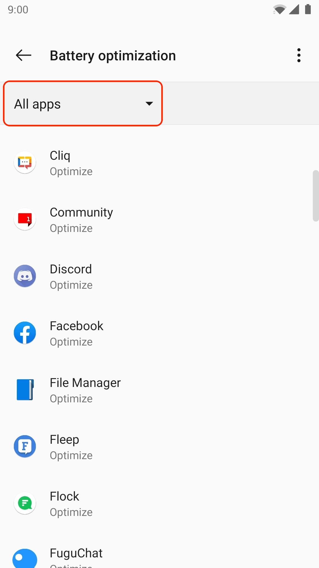 - Tap Apps not optimized and select All apps.