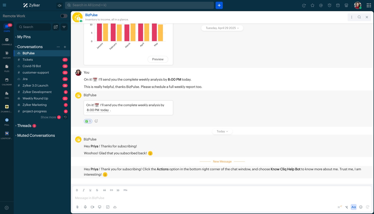 The Cliq Help Bot's welcome handler message, when a user unsubscribes to the bot and subscribes again.