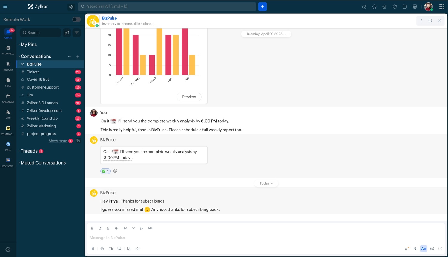 response.put("text","Hey *" + user.get("first_name") + "* ! Thank you for subscribing! Click the *Actions* option in the bottom right corner of the chat window, and choose *Know Cliq Help Bot* to know more about me. Trust me, I am interesting! :wink: ");