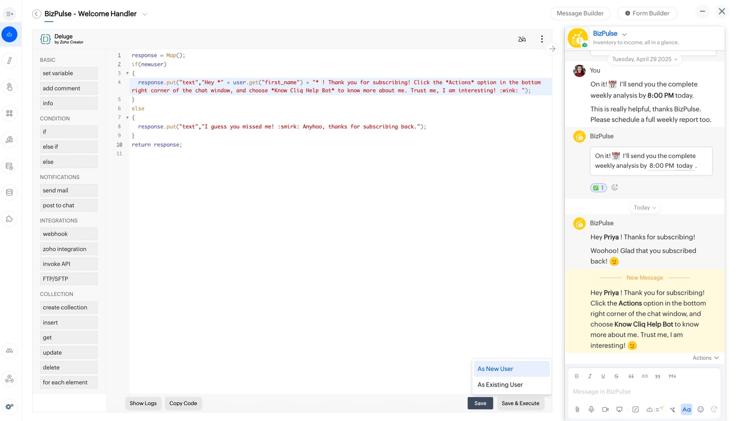 - As New User: This option lets you see a sample execution of the logic created for a new user in the welcome handler.