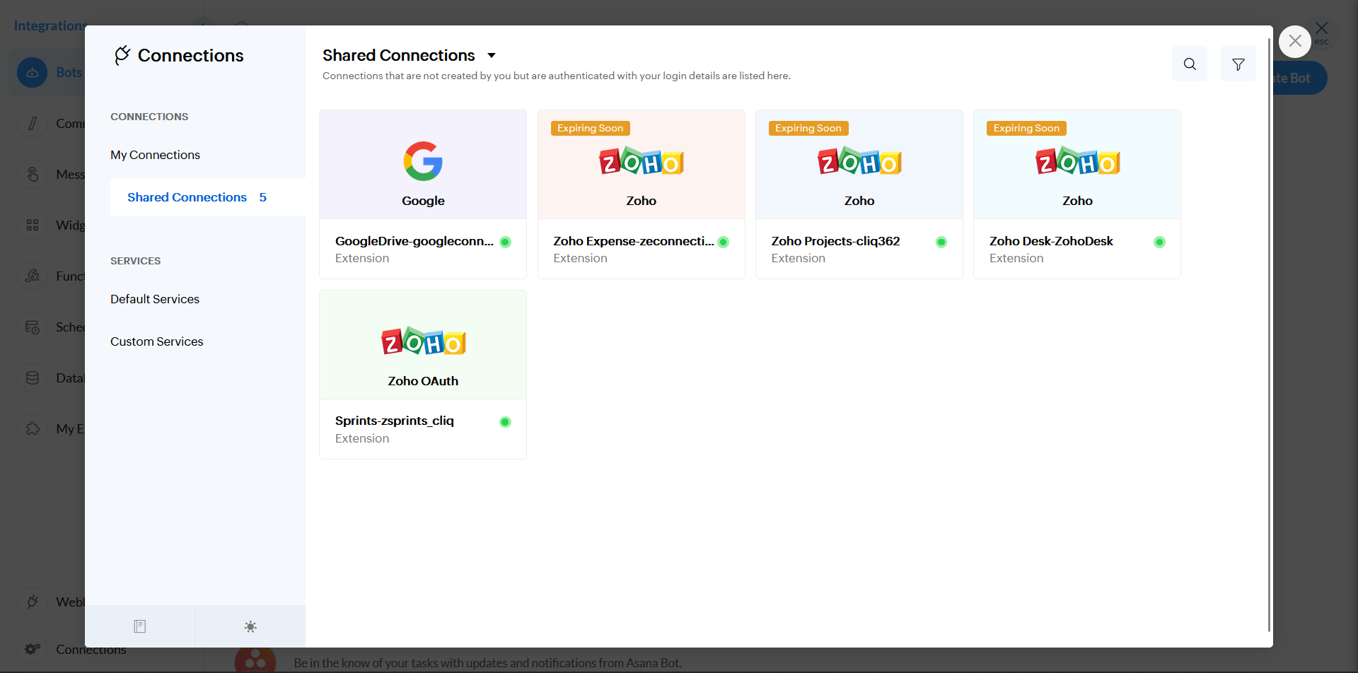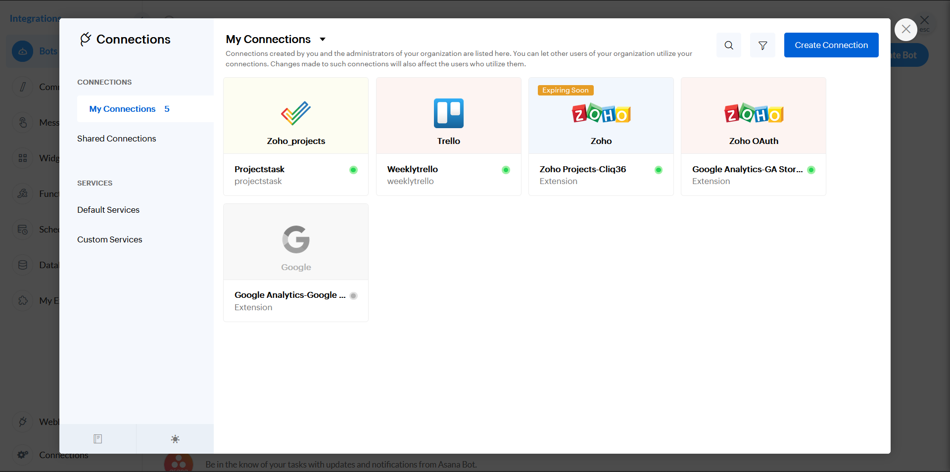 Connections is an interface to integrate third party services with your Zoho Service, in this case, Cliq. These connections are used in an URL invocation task to access authenticated data. To establish a connection, it is necessary to provide a Connection Name, Authentication Type amongst other details.