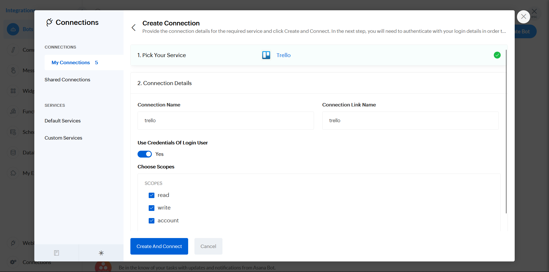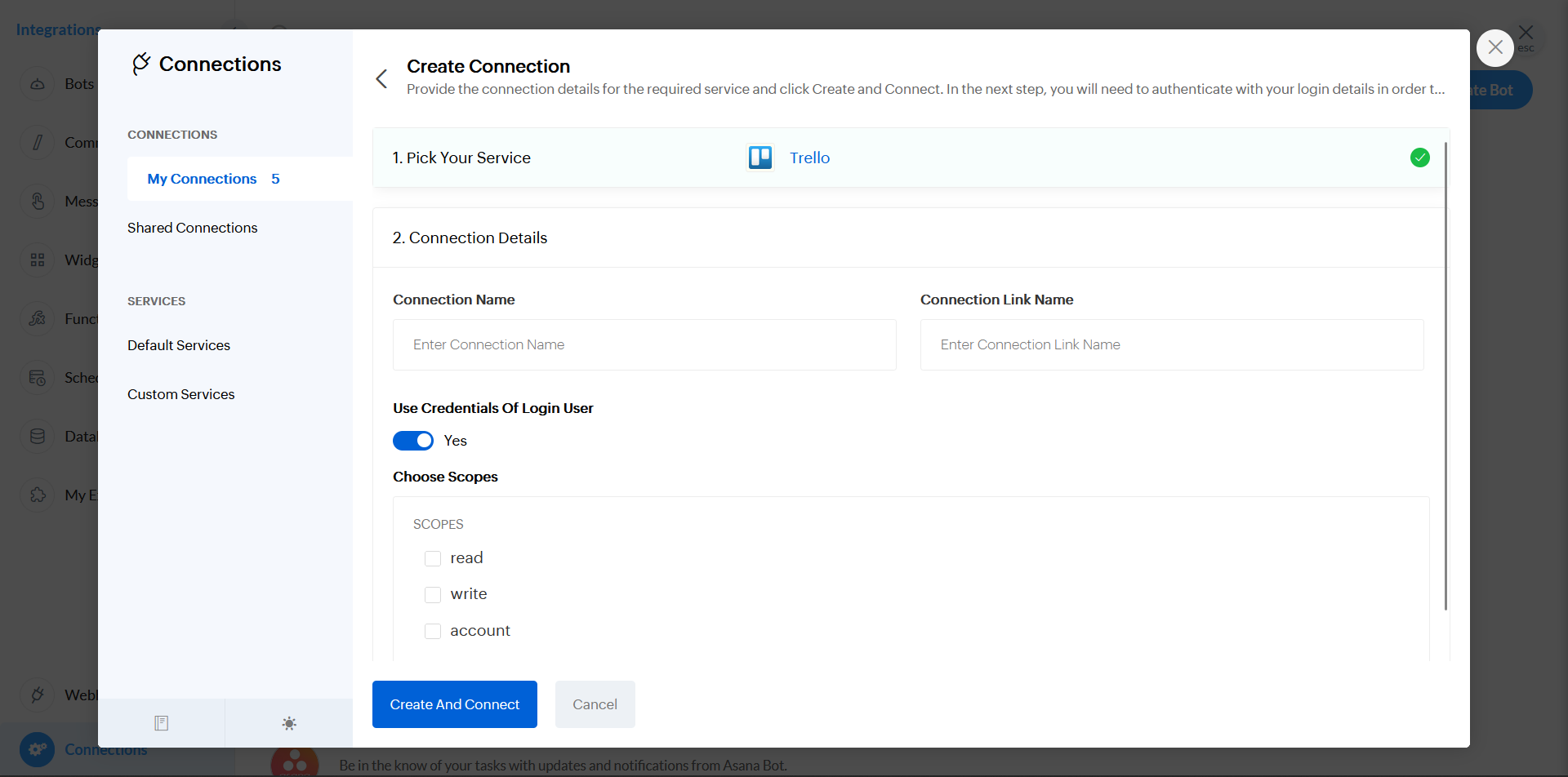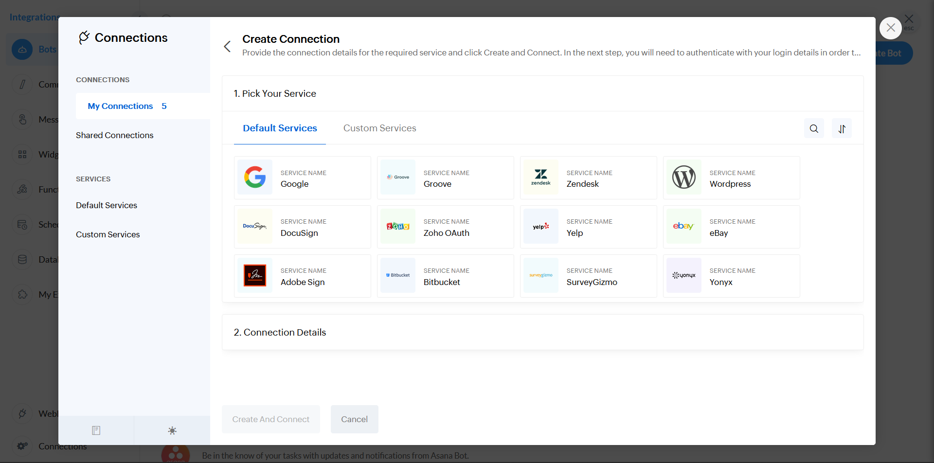 - You can also select the Custom Service option to create a connection in case the service you are looking for is not available in the pre-registered services list.
