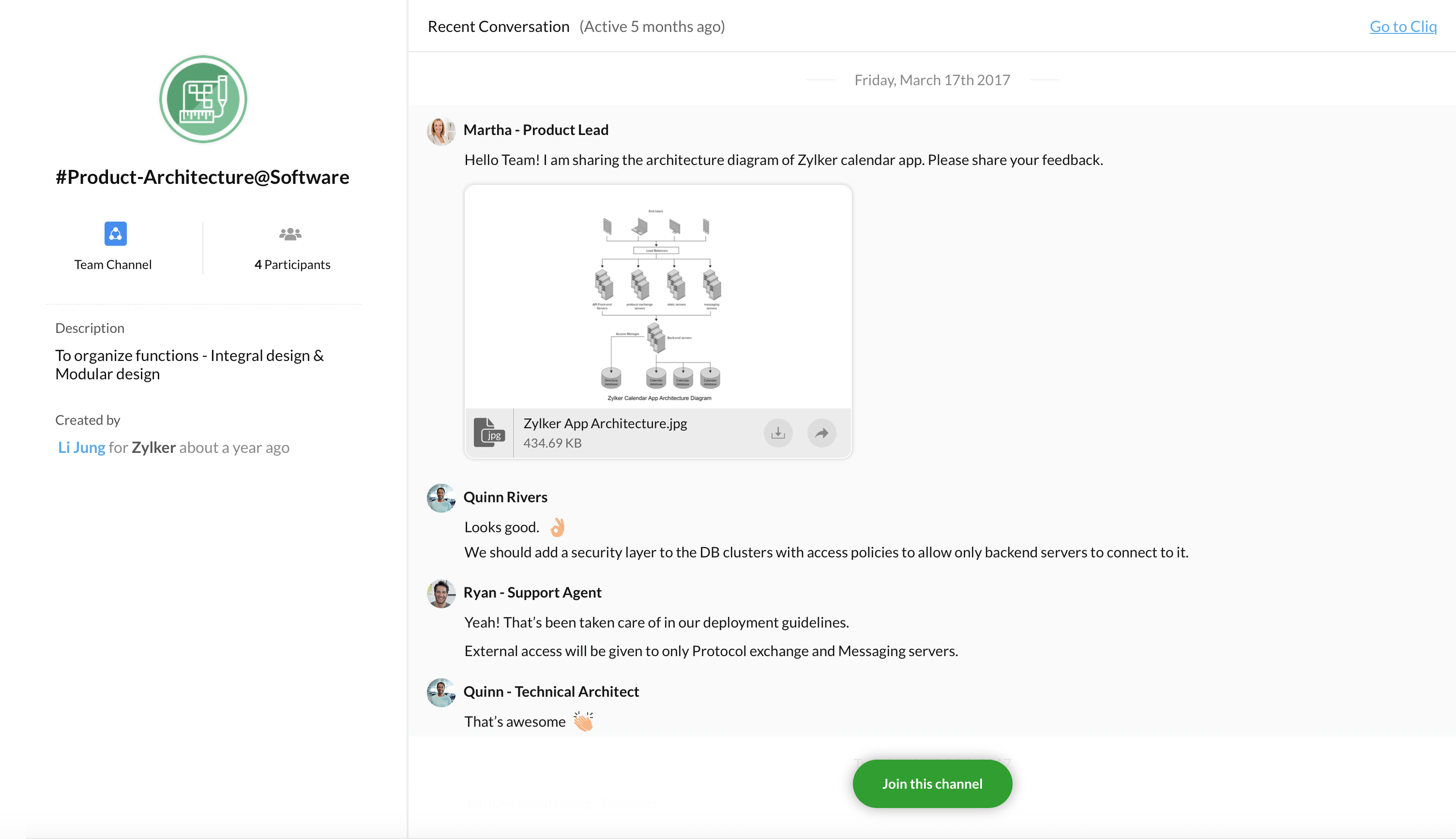 The channel permalink can be used to direct a user to join the channel. The permalink routes the user to the channel preview page on Cliq web. Accessing this URL in mobile will open the respective channel in your Cliq app. For example, if you are a part of a channel and would like your colleague to join that channel, you can share the channel permalink to them if you don't have permissions to add a user to the channel!