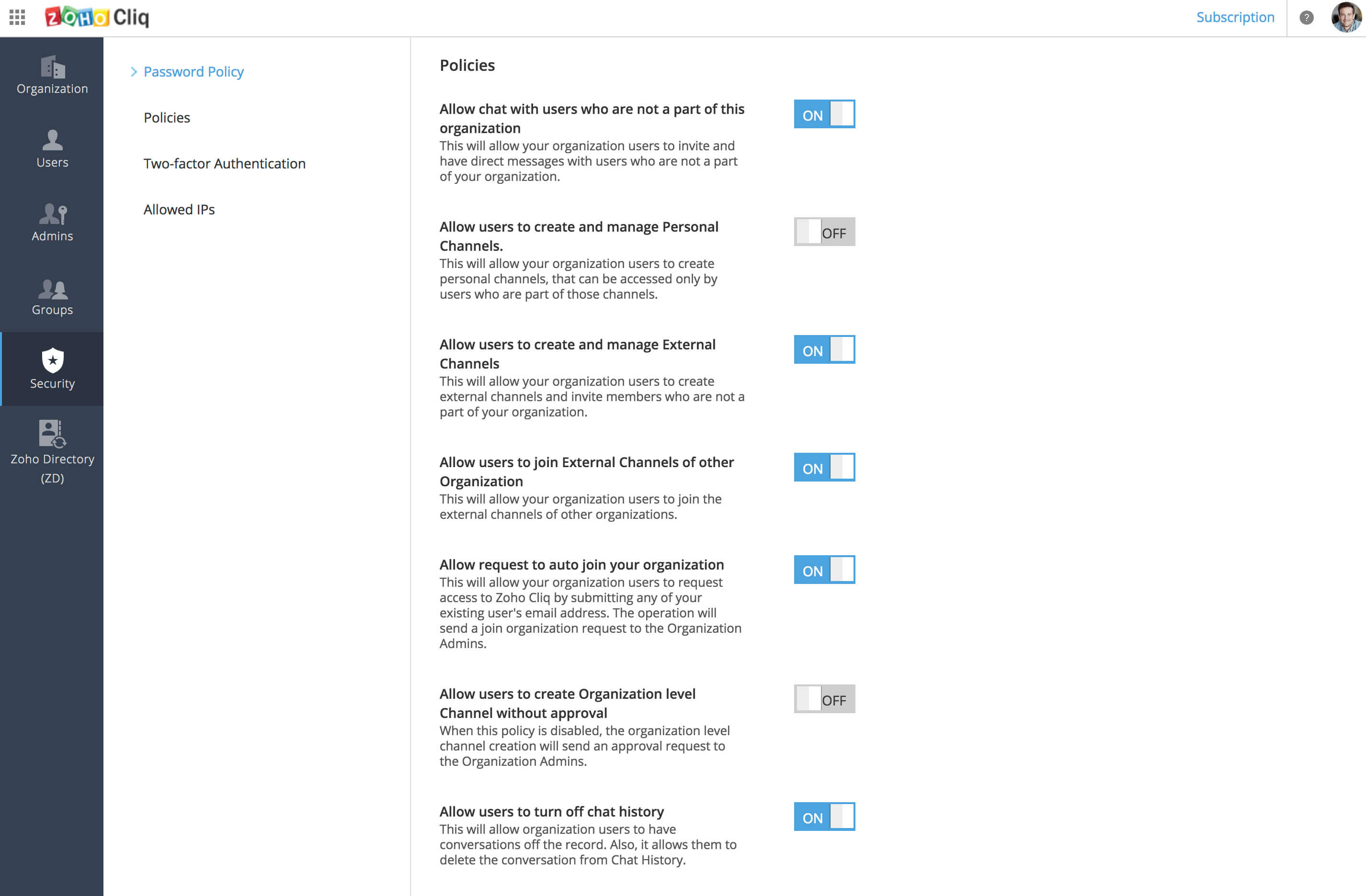 In the Cliq application, click on your Profile picture and select Admin Panel, and in it navigate to Security -> Policies. There are set of 7 policies that which the administrator has control to implement as rules for the organization. This makes up the Organization Policy. The organization policies are as listed below: